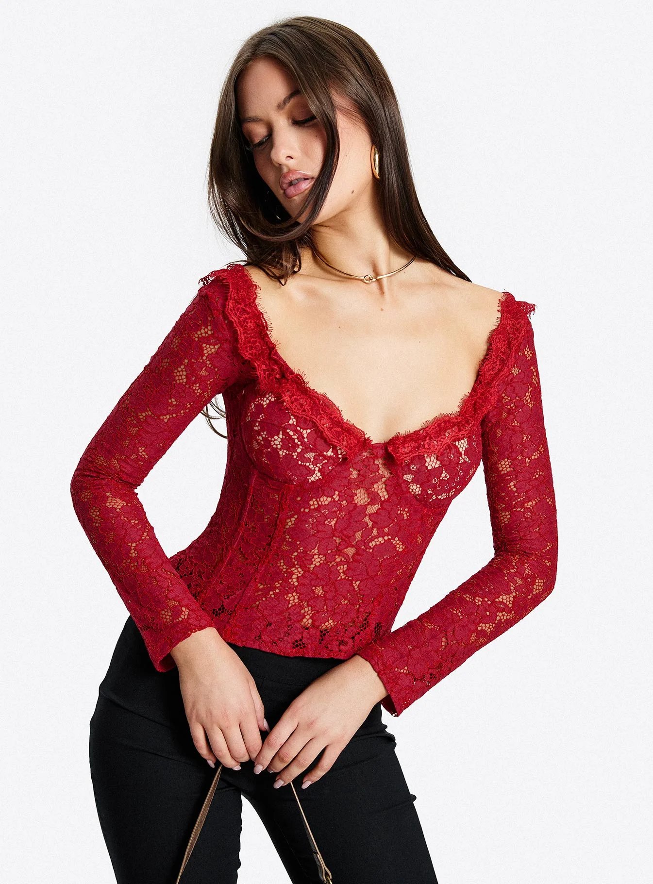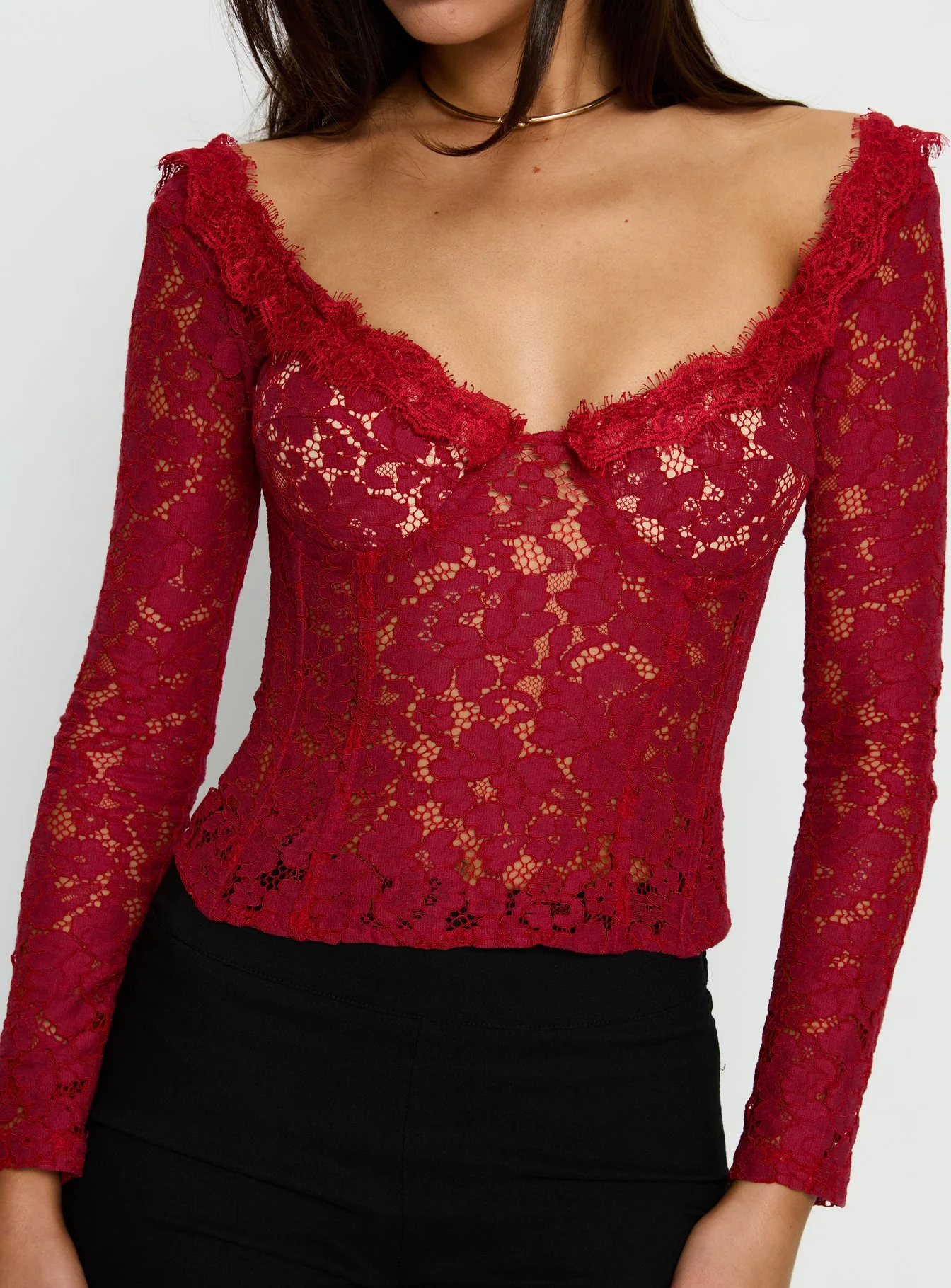 Miquela Long Sleeve Corset Lace Top Red