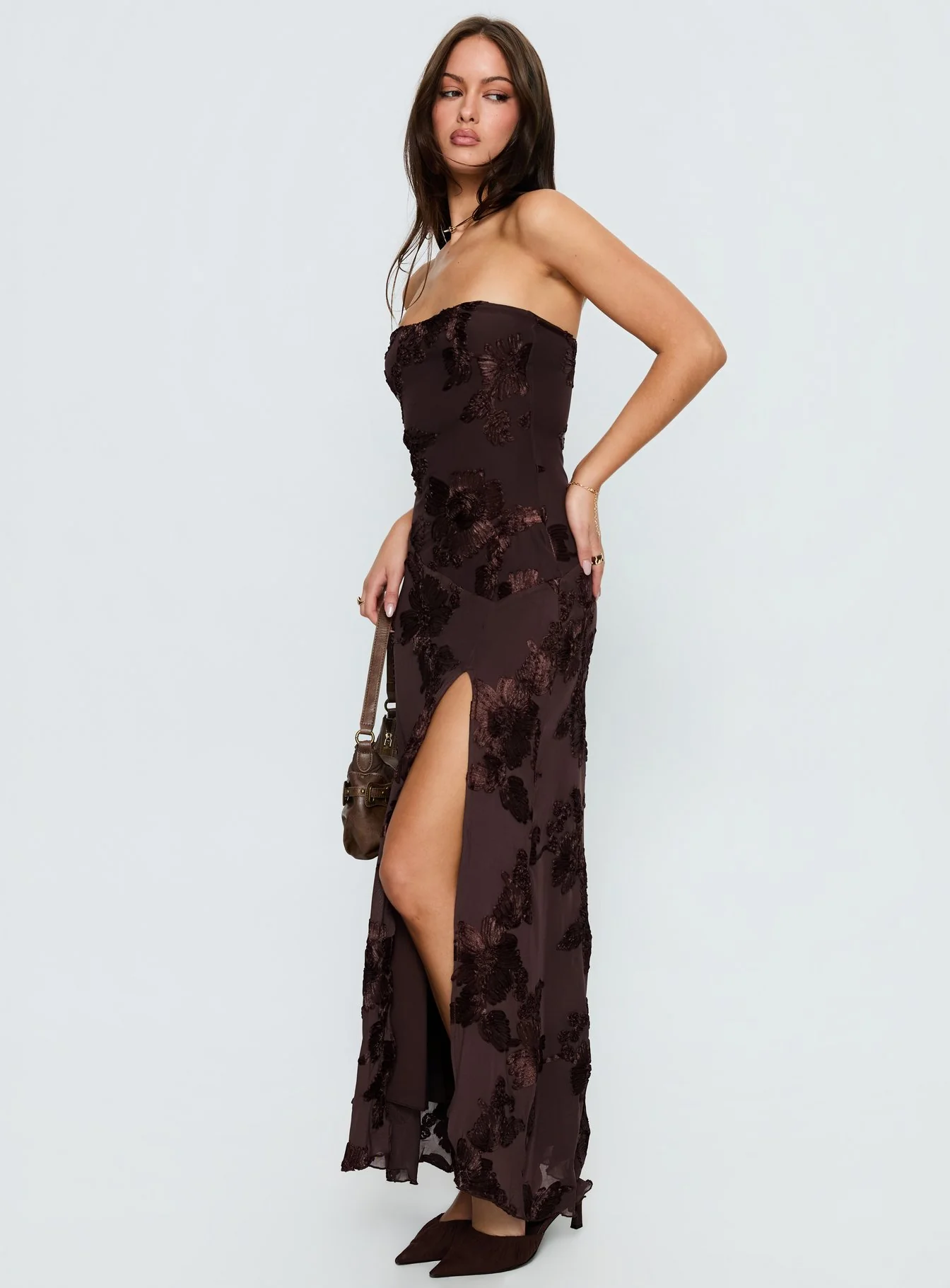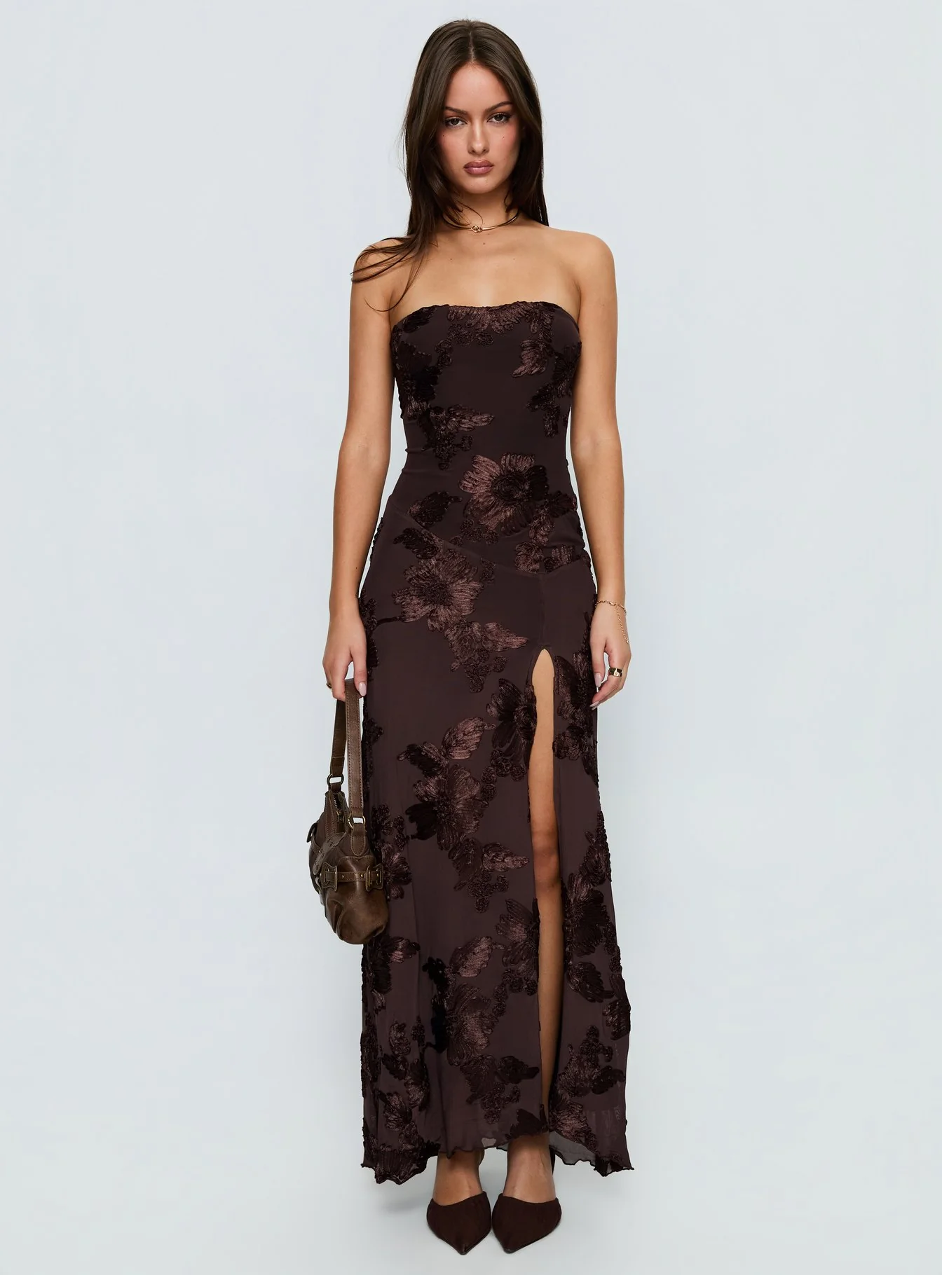 Maribeth Strapless Floral Maxi Dress Chocolate Brown