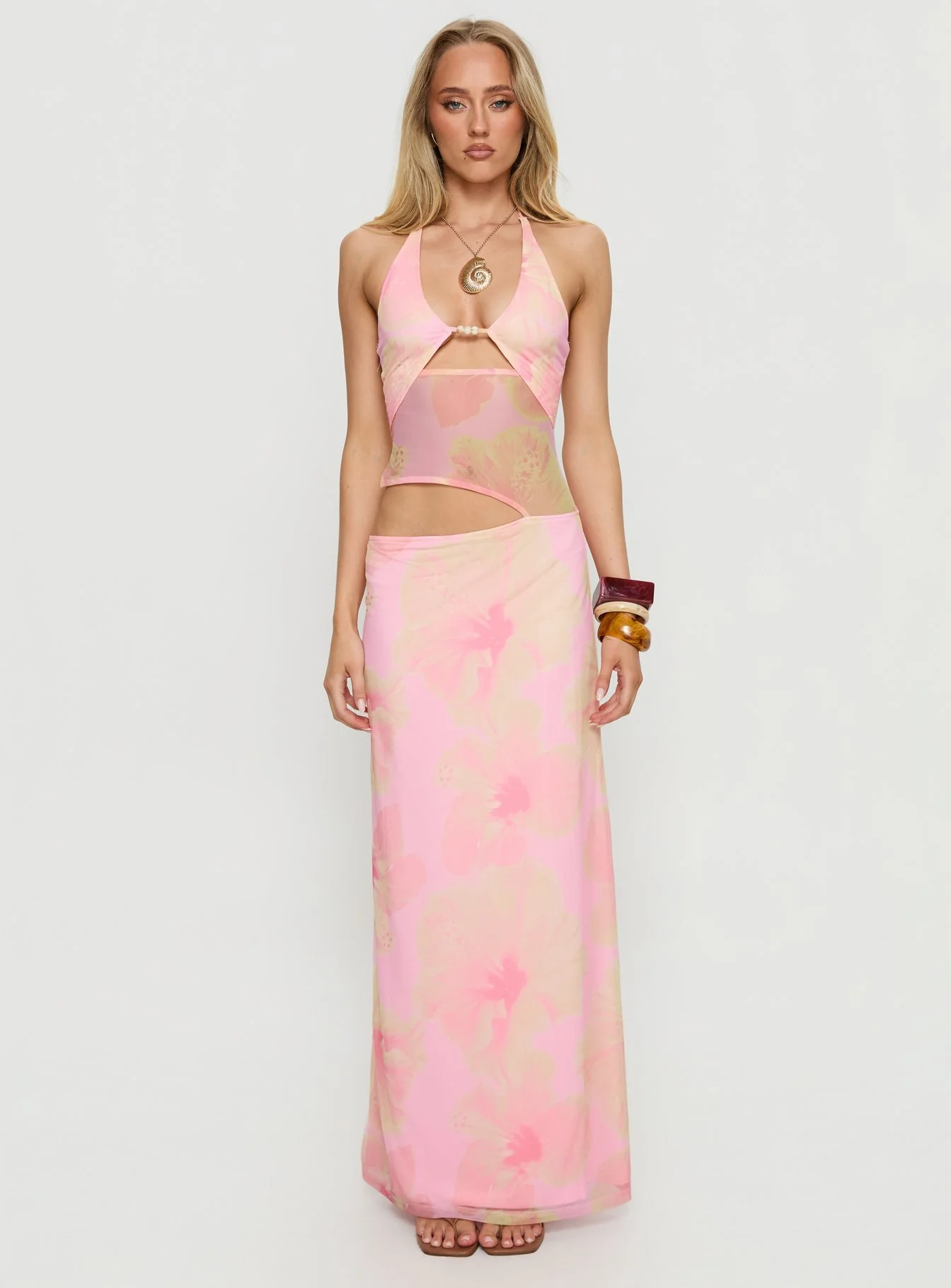 Dyanna Halter Mesh Maxi Dress Pink Floral