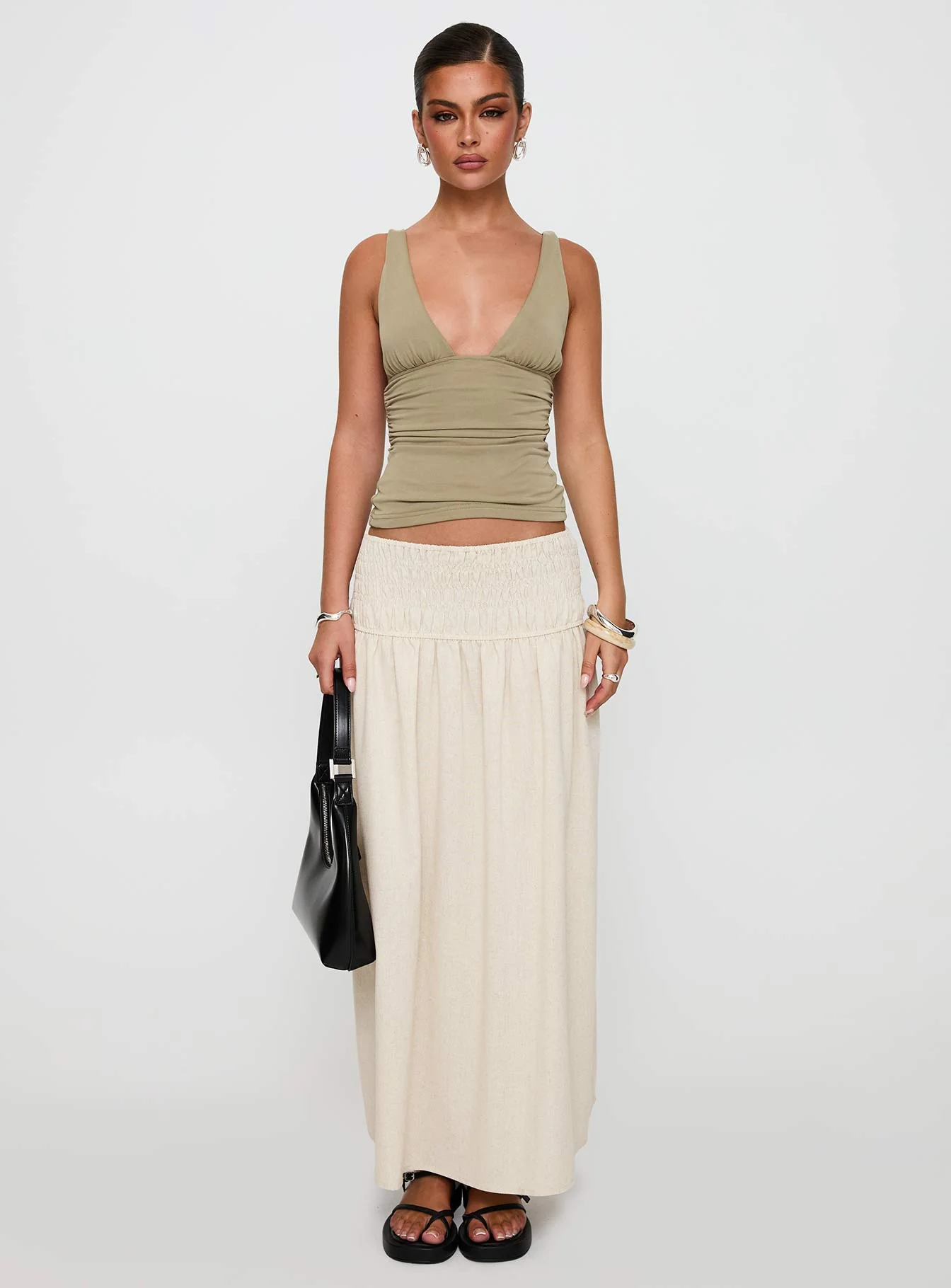 Small Towns Shirred Midi Skirt Beige